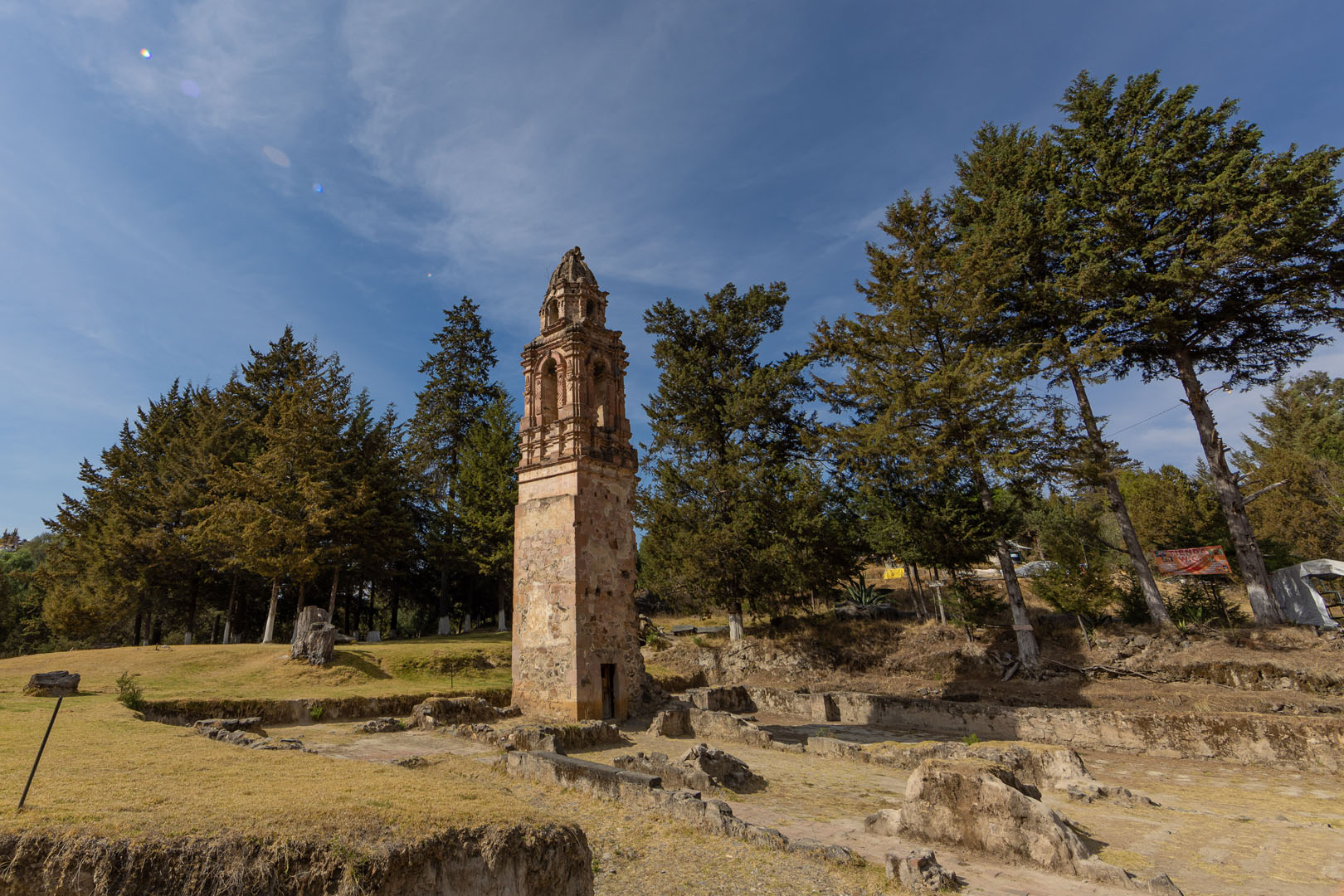 La iglesia se alza majestuosamente, con su torre y parte del altar visibles.