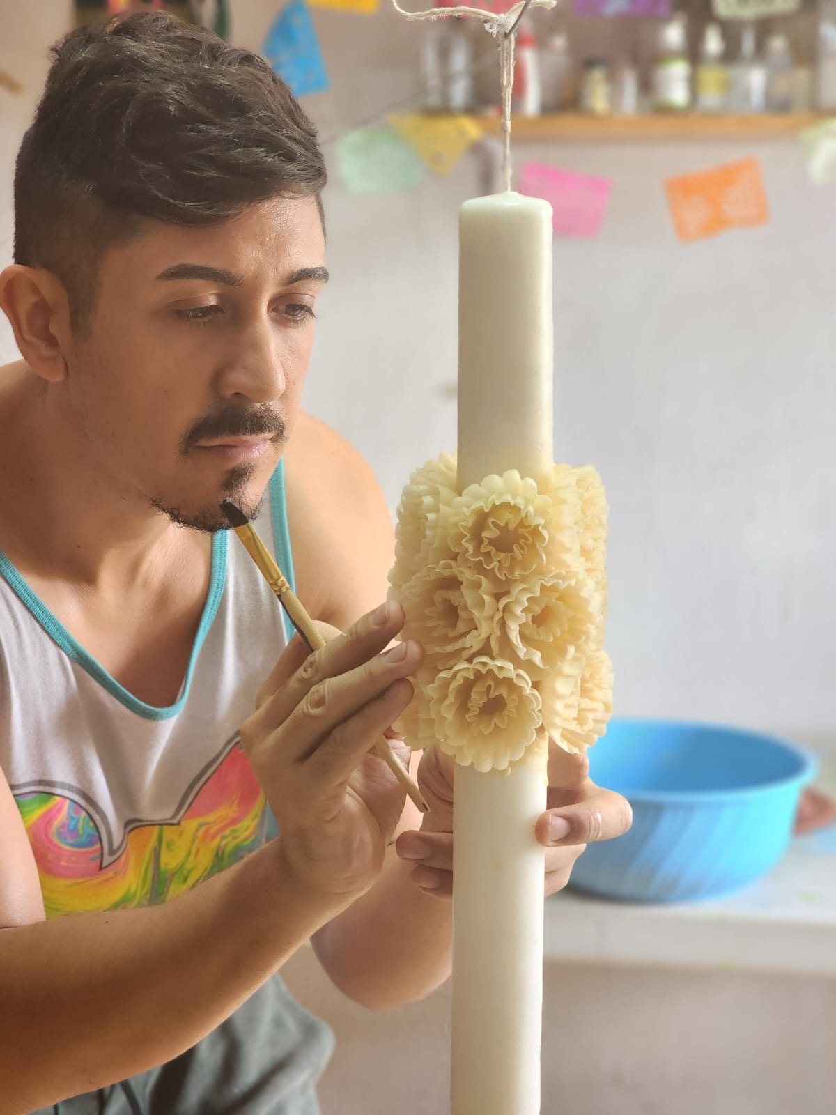 La elaboración de productos de cerería es una tradición heredada de Europa. Los artesanos cuelgan un aro de metal o carrizo de las vigas del tejado u otra estructura simlar. A este aro se atan los pabilos, que son hilos de algodón que quedarán en el centro de las velas. En el suelo, bajo el aro o «carrusel», se coloca un bracero con un recipiente para derretir la cera, que hoy en día se mezcla con parafina, un derivado del petróleo que mejora la combustión de las velas. También se añade colorante si es necesario.