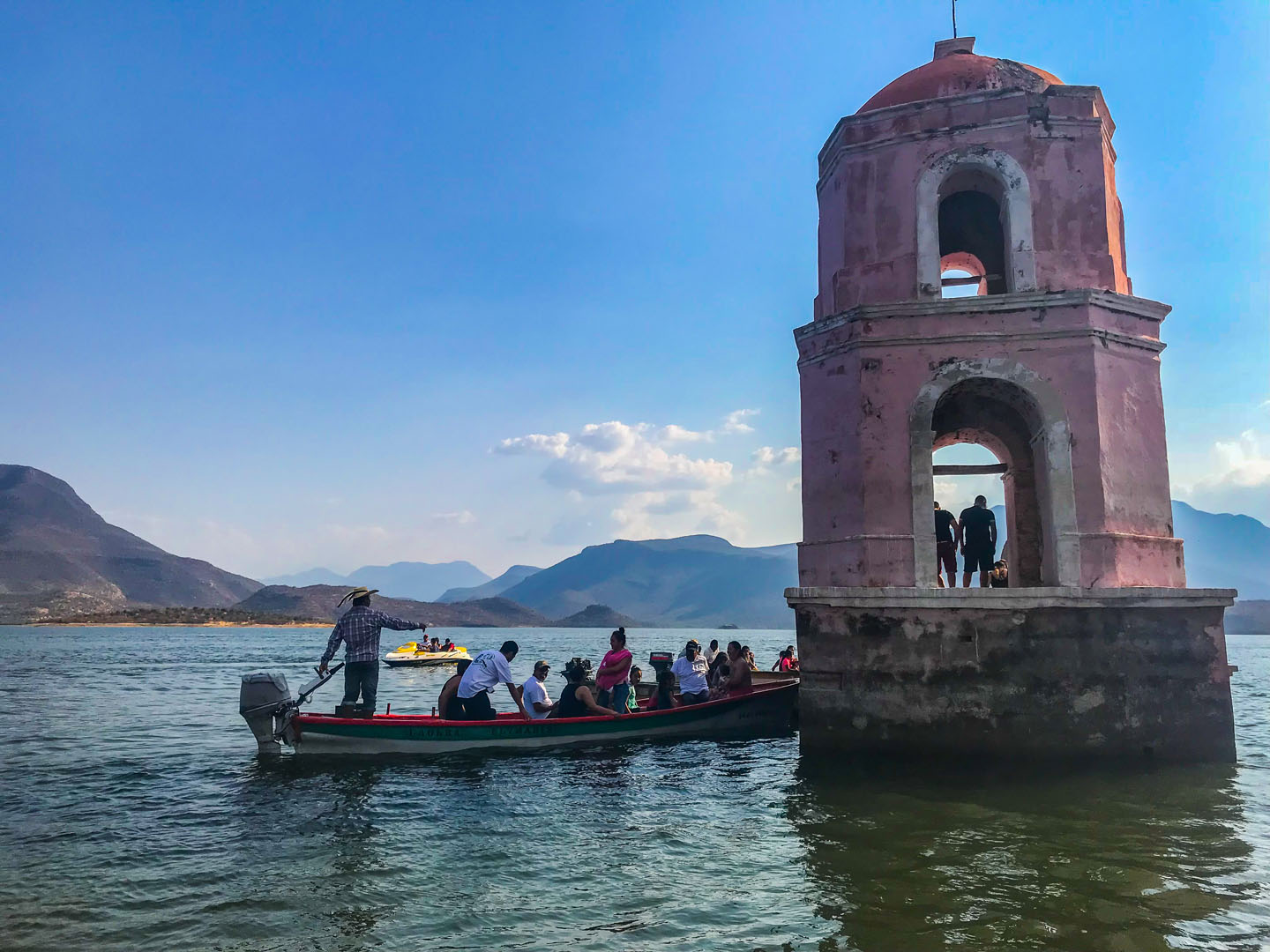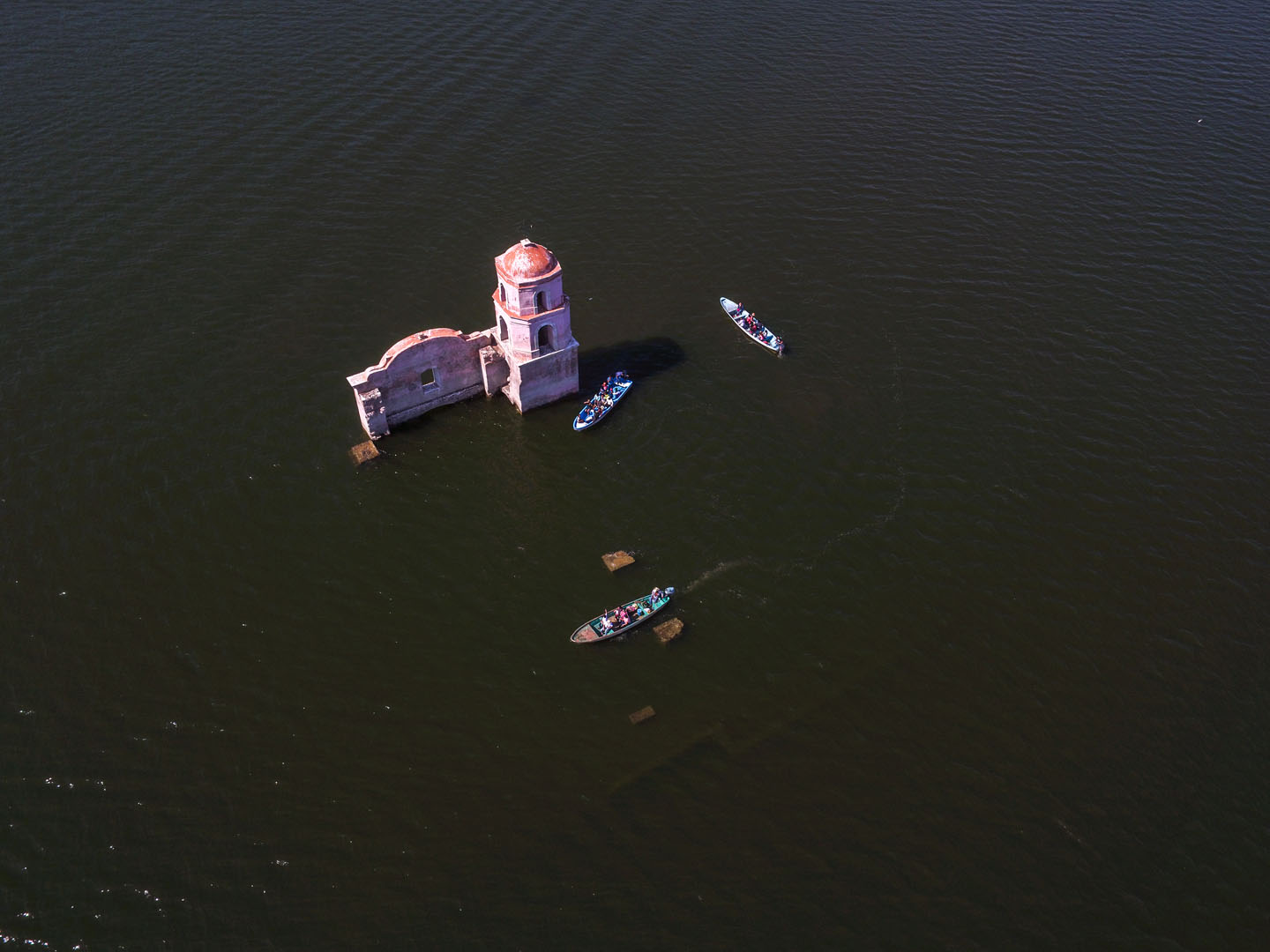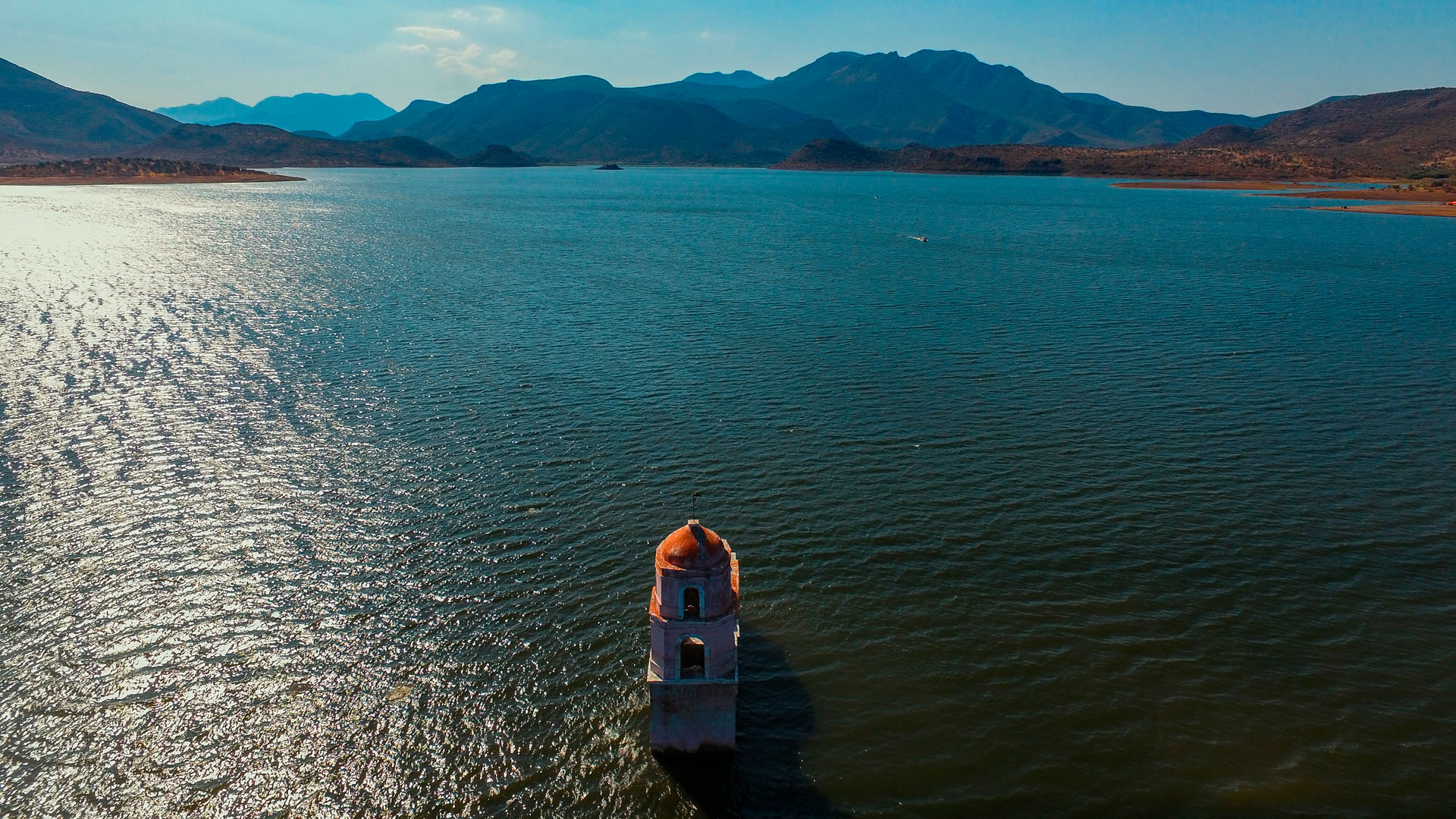 La estructura parcialmente sumergida sigue en pie, con parte de su majestuosa arquitectura emergiendo del agua, accesible solo en lancha. Este panorama único, donde la historia se encuentra con la naturaleza, ha convertido a la Iglesia Hundida de Churumuco en un destino turístico singular y uno de los más visitados en Michoacán.