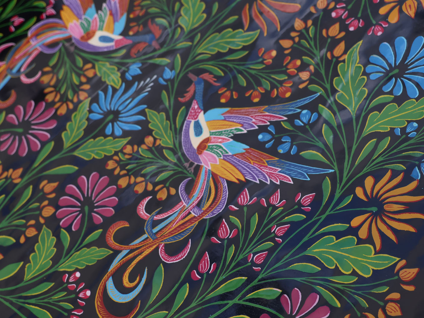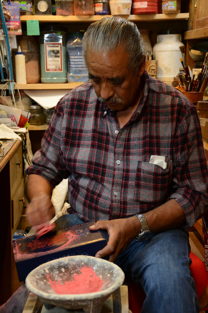 Para crear una pieza terminada, se necesita la habilidad de varias manos. Primero, quienes fabrican el plato o el mueble con maderas de aile, madroño, tzirimo, cedro, parota o pino de primera calidad. Luego, quienes laquean la pieza con laca automotiva, en lugar de maqueado tradicional. Después, el maestro artesano que la decora, y finalmente, quien la protege con una capa de resina, necesaria si la pieza se usará regularmente.