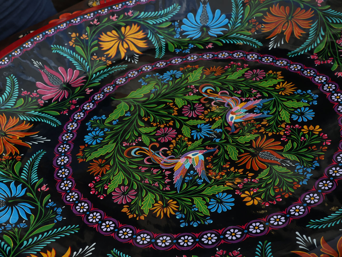 Los motivos decorativos se dibujan con una pasta mordente sobre la superficie ya laqueada. Tras secar durante un día, se aplica una hoja de oro que se adhiere a la pasta. Finalmente, el decorado se completa con pinturas al óleo, dando como resultado una obra exquisita y duradera.