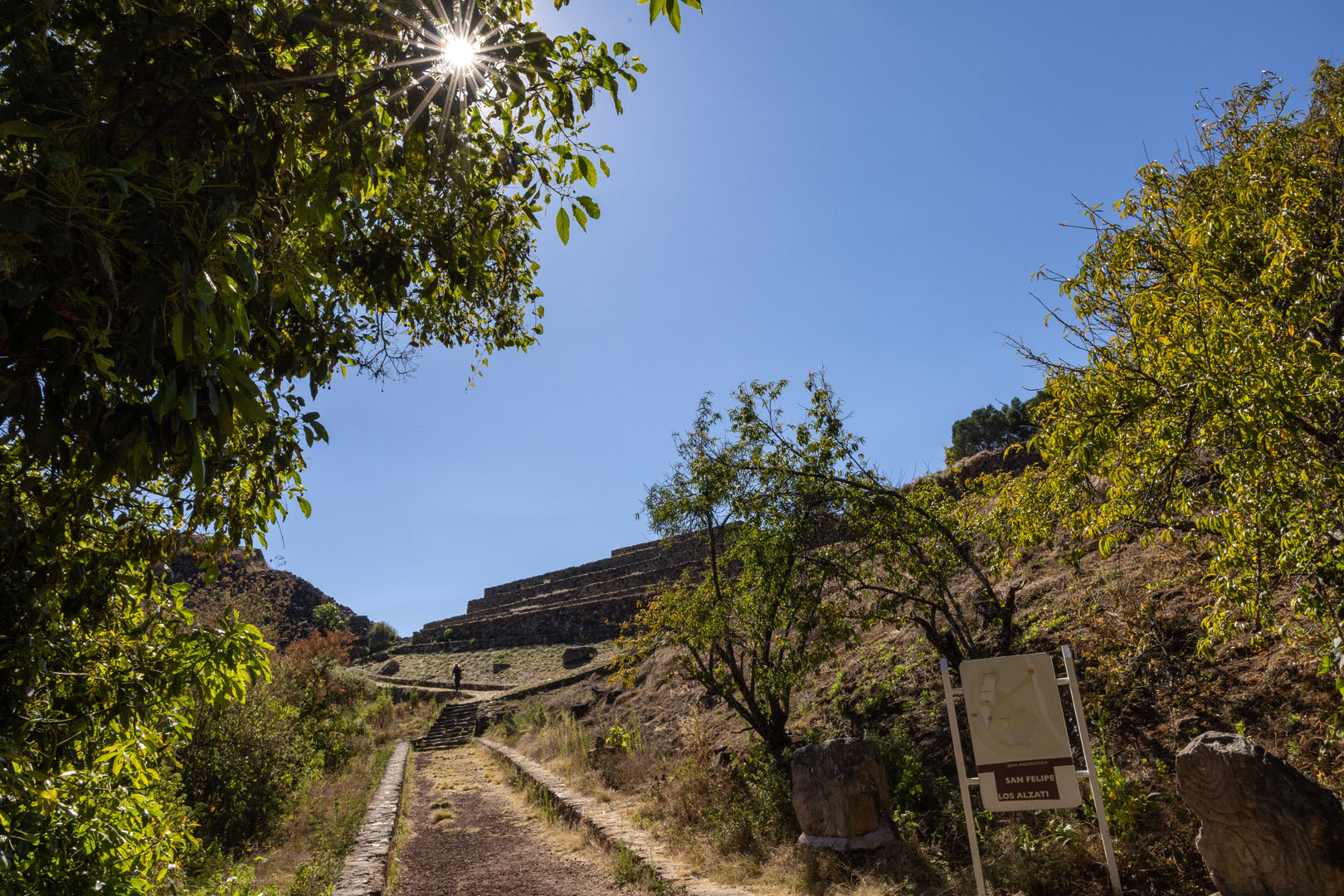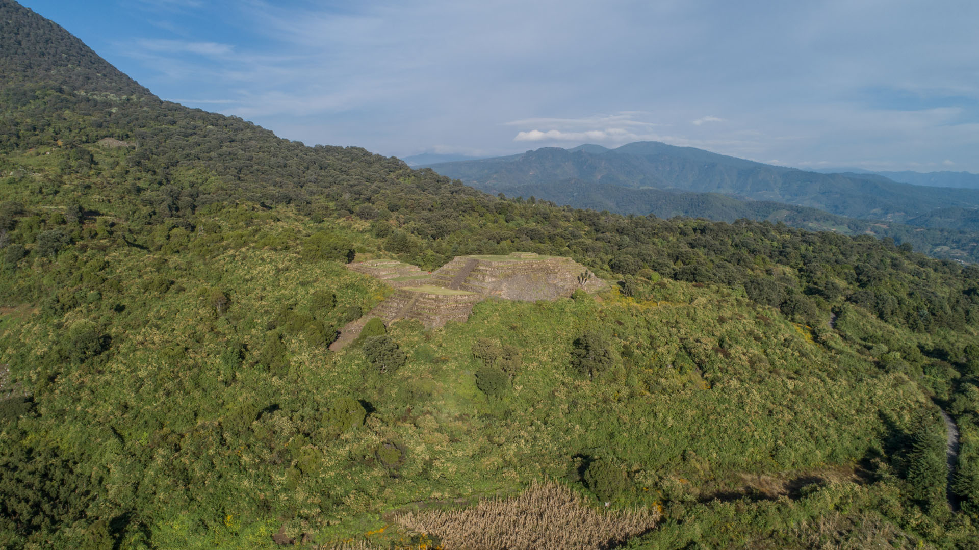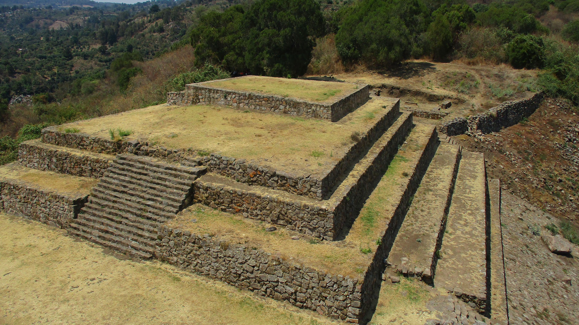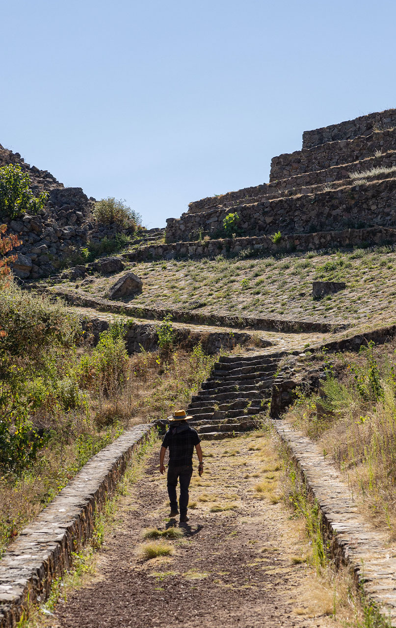 El centro ceremonial se encuentra al pie del volcán de Zirahuato, cuya altitud oscila entre 1,930 y 2,100 metros sobre el nivel del mar. Las estructuras se integraron al terreno natural mediante muros de contención, utilizando piedra volcánica. En las fachadas se emplearon piedras planas, mientras que las escaleras y esquinas se reforzaron con rocas trabajadas.