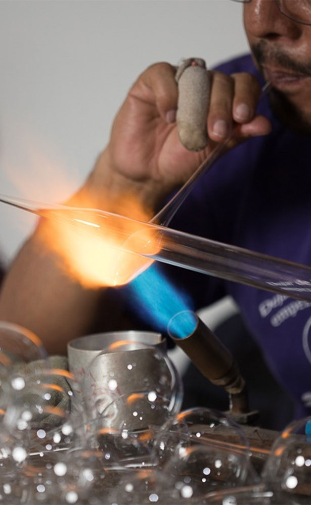 La elaboración de esferas comienza con el moldeado del tubo de vidrio, que se calienta con un mechero y se sopla manualmente hasta obtener la forma deseada. Las formas principales incluyen bola, chimborro, chupirol, chilaca y, recientemente, el torcido. También se crean figuras como animales, uniendo las partes con calor.