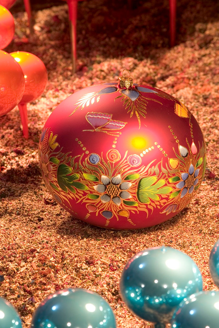 El plateado se realiza inyectando nitrato de plata en el interior de la esfera para preparar el fondo para el color y mejorar la resistencia. Luego, las esferas se lavan, se secan, se pintan una por una con laca industrial o transparente, y se dejan secar.