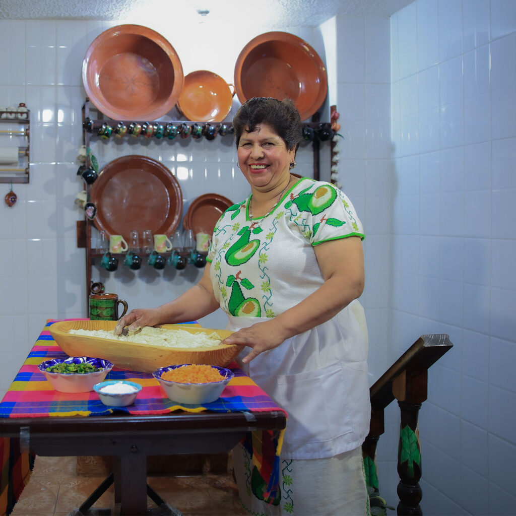 Carmen, originaria de Uruapan, es una Maestra Cocinera Tradicional que, con gran agilidad, prepara las recetas tradicionales purépechas. Cada uno de sus platillos refleja sus más de 35 años de experiencia como cocinera.