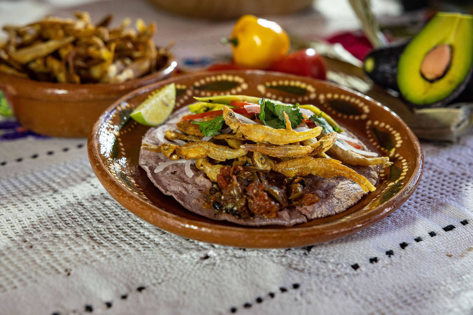 Dicen que nadie hace los tacos de charal como ella. Primero los descama, luego les quita las agallas y, finalmente, los dora con leña de pino para evitar que se amarguen. Los sirve sobre tortillas con jitomate, cebolla, cilantro, aguacate y una salsa de xoconostle o de pitayas, usando siempre chile perón amarillo.